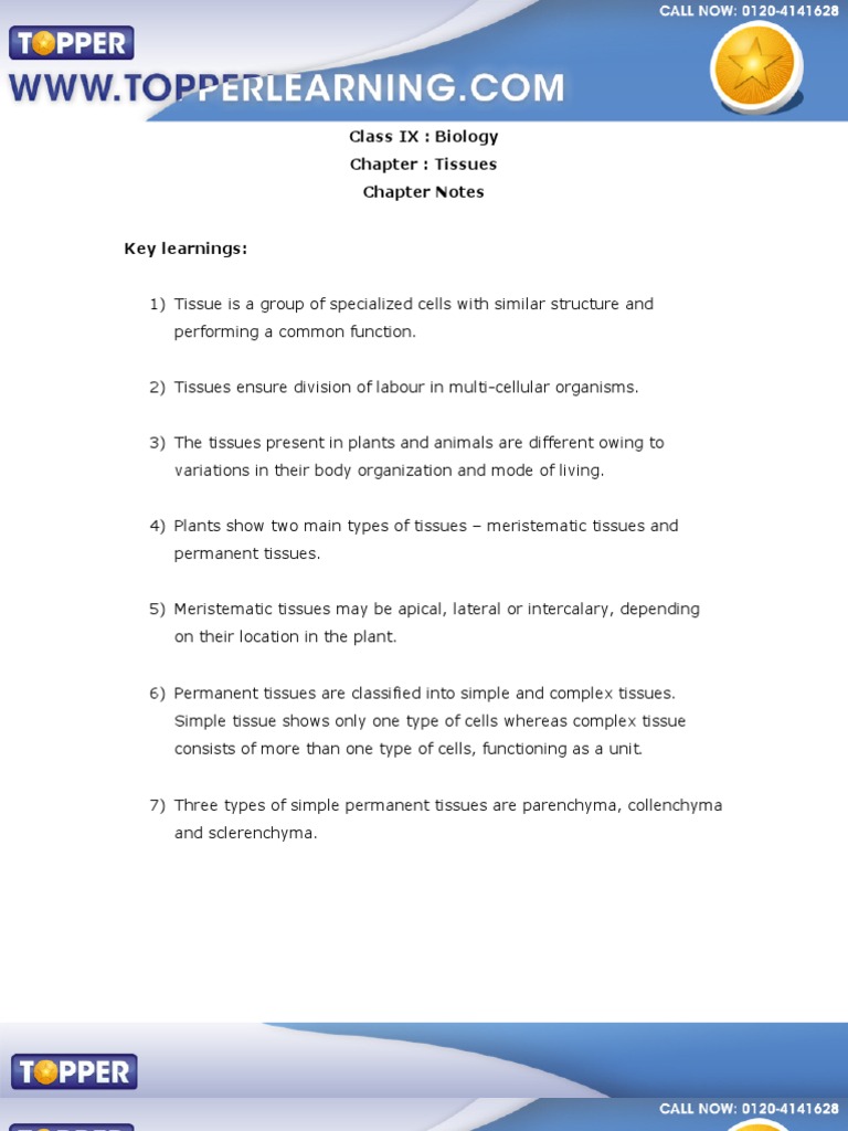 The connective tissue cells are freely arranged in a matrix and are widely distributed in the body. You can revise it whenever you want. Class 9 biology tissues notes include plants and animal tissues notes. It recepts and transmits the information between different parts of the body. Complex tissues are of two types:
